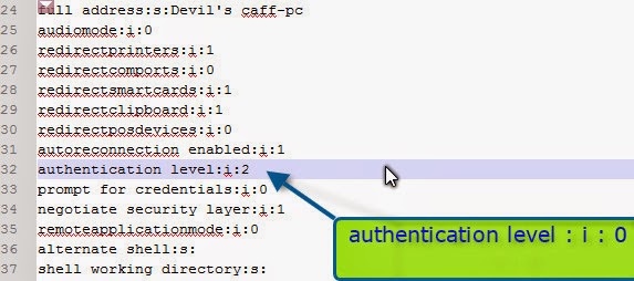 6. Change “authentication level:i:2” to “authentication level:i:0“. What this does is take’s all the security measures away from connecting.