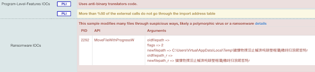 Within the detailed report you can see the IOCs generated by the FCE feature, extracted by SecondWrite’s driver. In this example we see that the sample attempts to repeatedly call a a single API to avoid analysis. The FCE feature can rewrite one or more conditional statements to get the code sample to execute. Furthermore, some of the discovered events were characterized as Ransomware IOCs, Stealth IOCs, and Anti-Analysis IOCs.